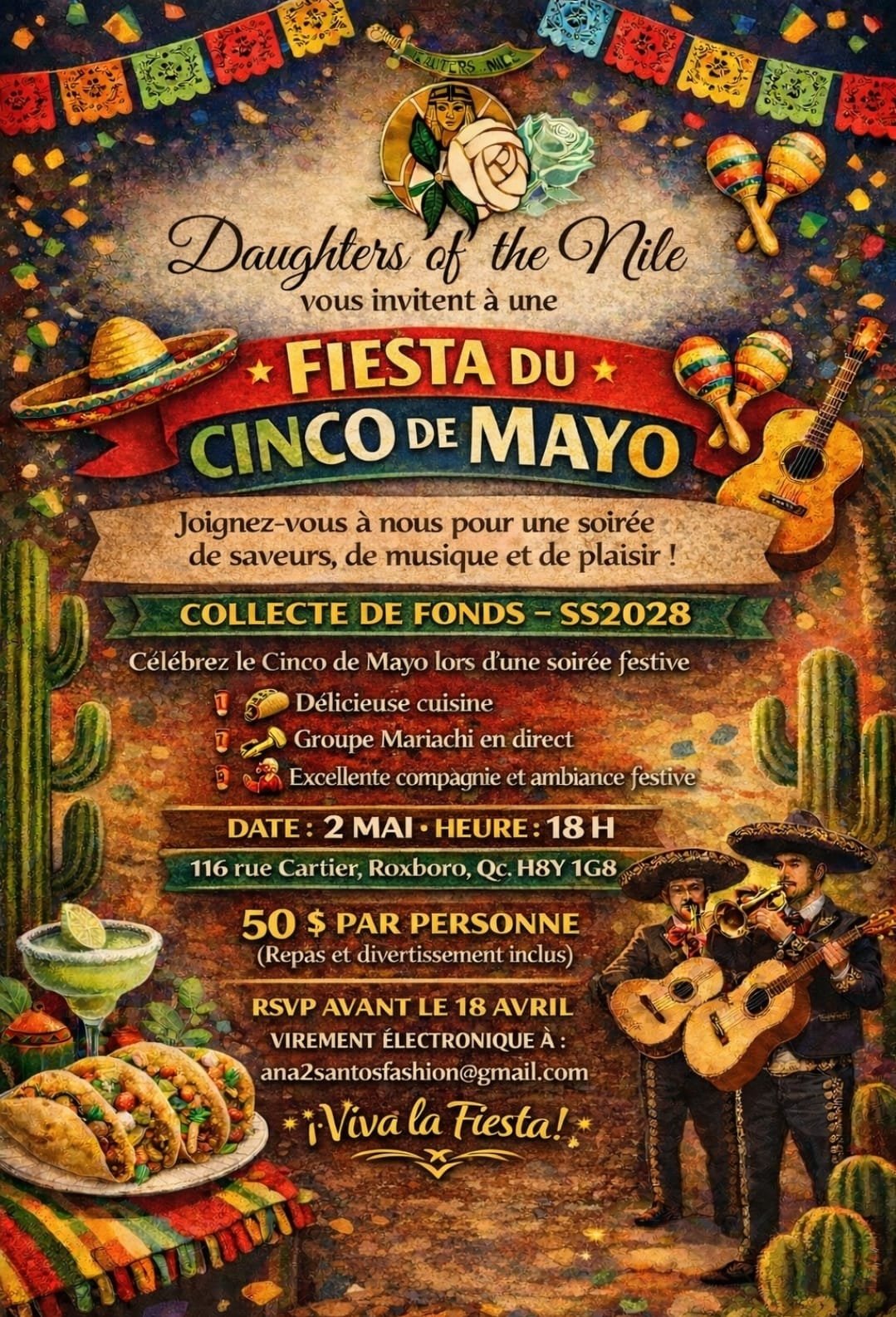 Back to All Events DON Cinco de Mayo Fiesta Saturday, May 2, 2026 6:00 p.m. 10:00 p.m. 116 Rue Cartier Roxboro, QC, H8Y 1G8 Canada (map) Google Calendar ICS