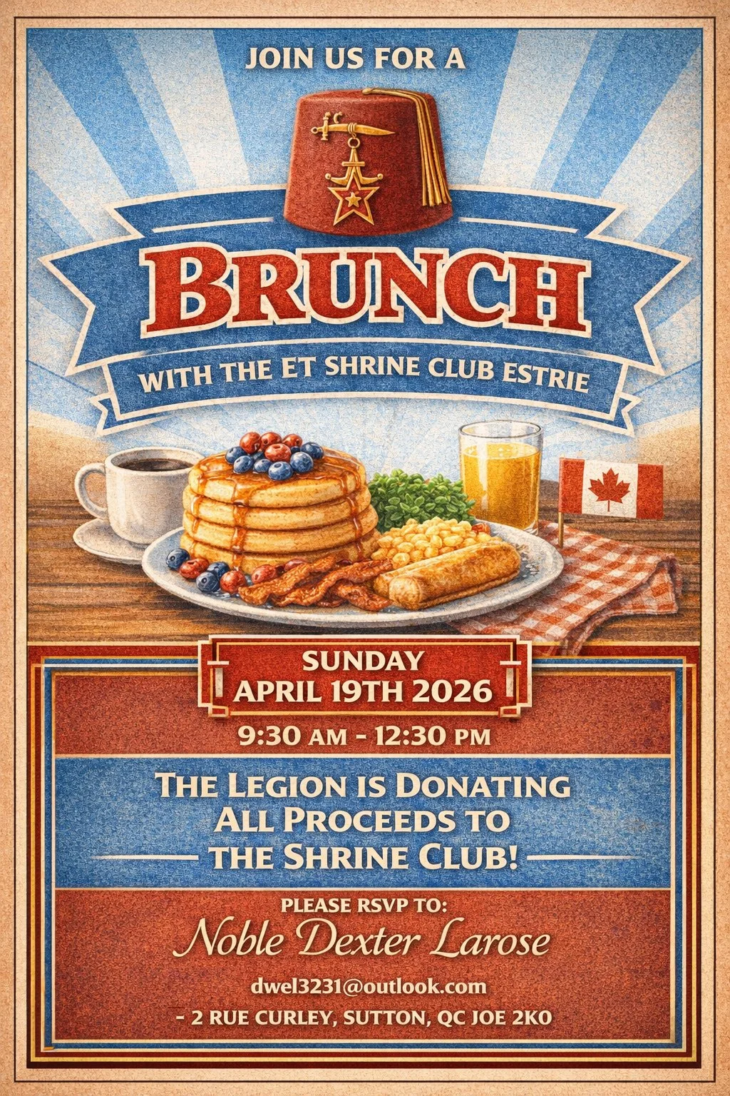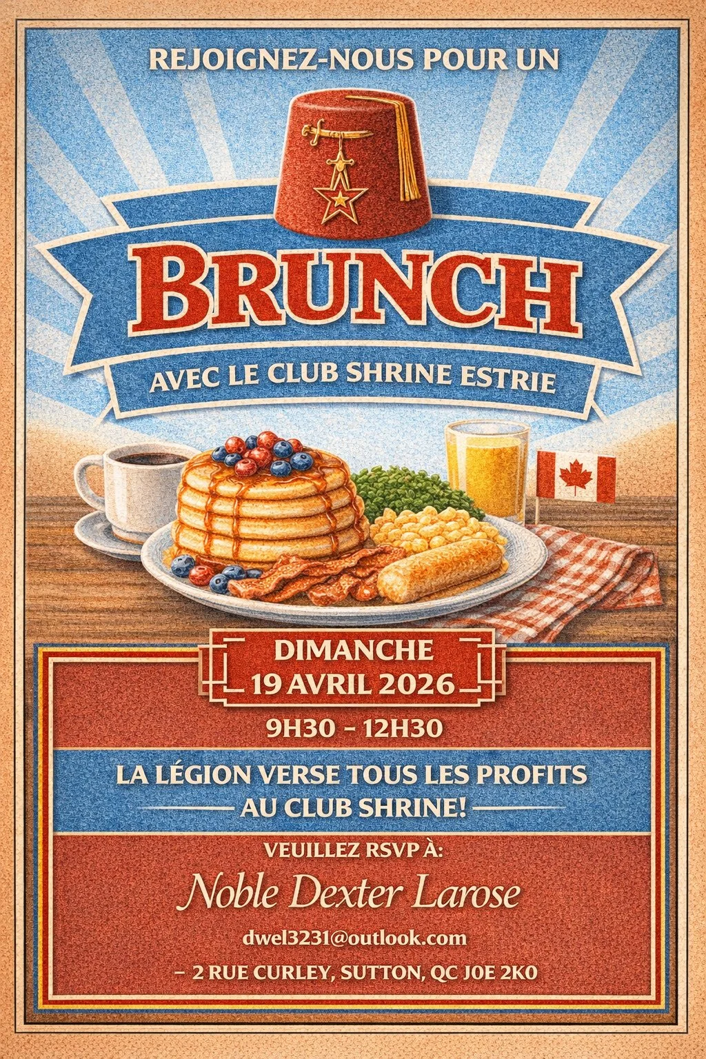Back to All Events ET Shrine Club Brunch Sunday, April 19, 2026 9:30 a.m. 12:30 p.m. Royal Canadian Legion – Sutton 2 Rue Curley Sutton, QC, J0E 2K0 Canada (map) Google Calendar ICS