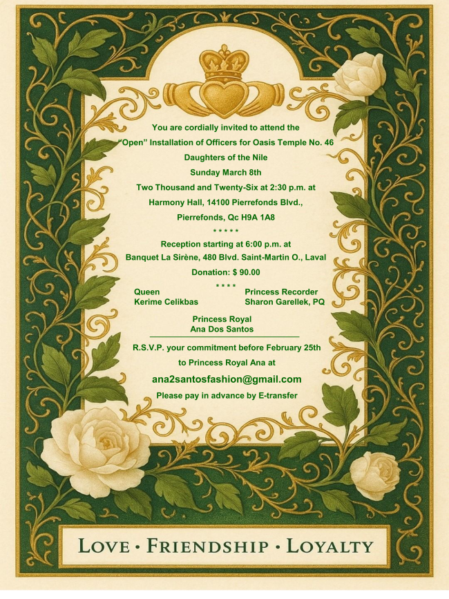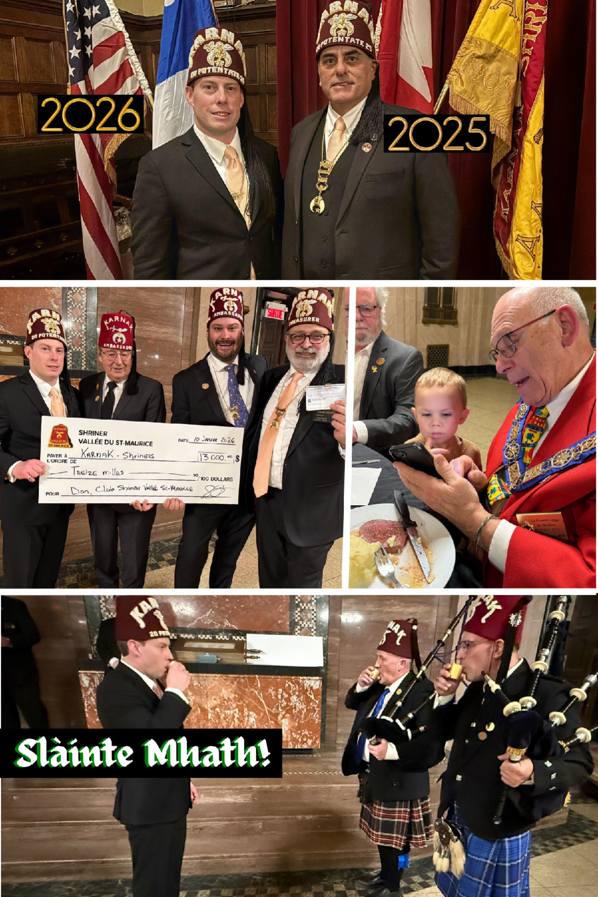 De nouveaux départs sont en cours alors que nous préparons de nouvelles idées d'événements et d'initiatives pour les membres. Votre Divan a rencontré et aidé les clubs et les unités alors que nous nous préparons ensemble pour une excellente année 2026. Notre nouveau bâtiment est en cours de construction et nous espérons avoir bientôt de bonnes nouvelles à partager alors que nous attendons le raccordement à l'électricité. J'ai hâte de vivre de nombreux moments de plaisir et de camaraderie avec nos défilés annuels de la Saint-Patrick qui approchent à grands pas !